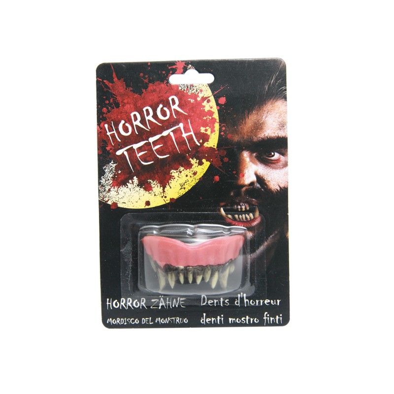 Dientes de Hombre Lobo con pasta termoplastica amoldable a tu dentadura. Instrucciones de uso en el embalaje.Pueden ser Reutilizados una y otra vez.