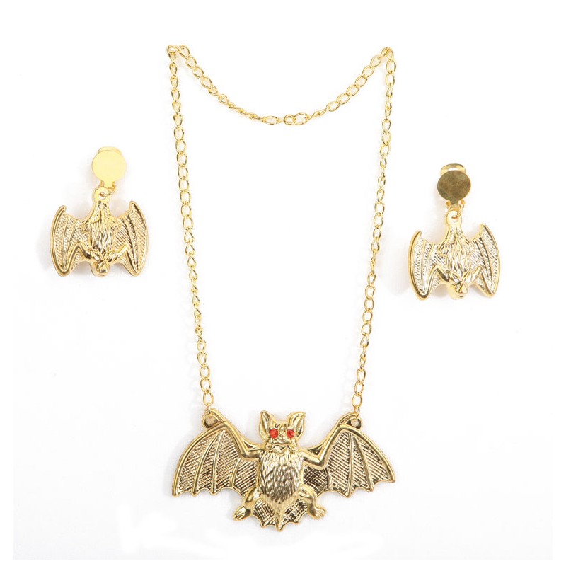Callar y pendientes metalicos con forma de murcielagos. Complementos de halloween.Dorado.