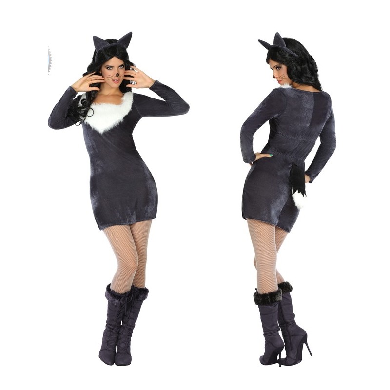 Disfraz de Loba,color negro tela aterciopelada y cuello blanco con tela de peluche.NO incluye botas