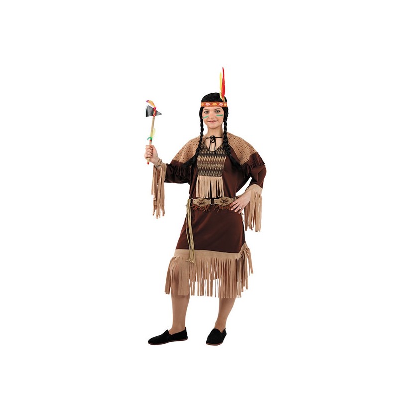 Disfruta haciendo el indio con tus amigos con este disfraz de india para mujer. Perfecto para fiestas temáticas. El traje está compuesto por un vestido marrón con flecos, un cinturón y cubrehombros.