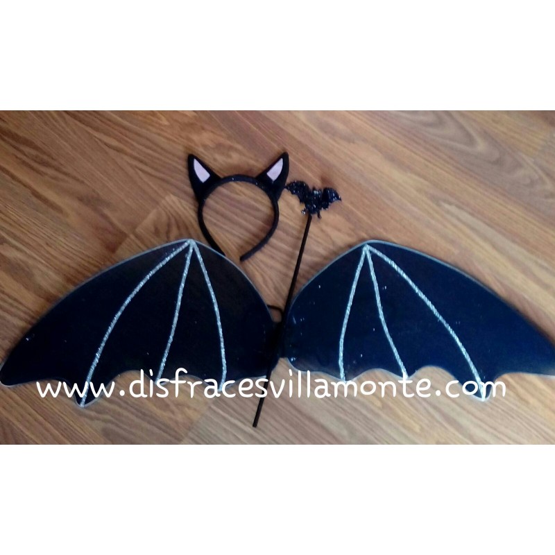 Alas Murciélago,con varita y orejas..negras con purpurina plata