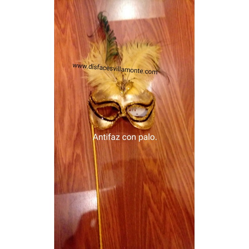 Antifaz Dorado,con palo y plumas