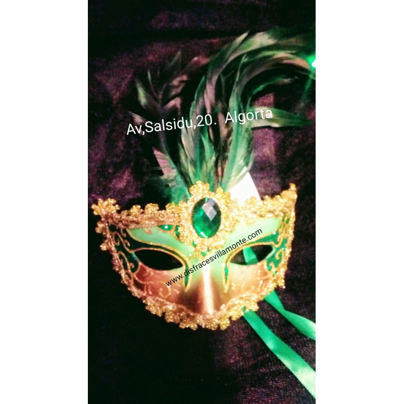 Antifaz Veneciano, color verde con dorado y plumas..se ata con lazo.