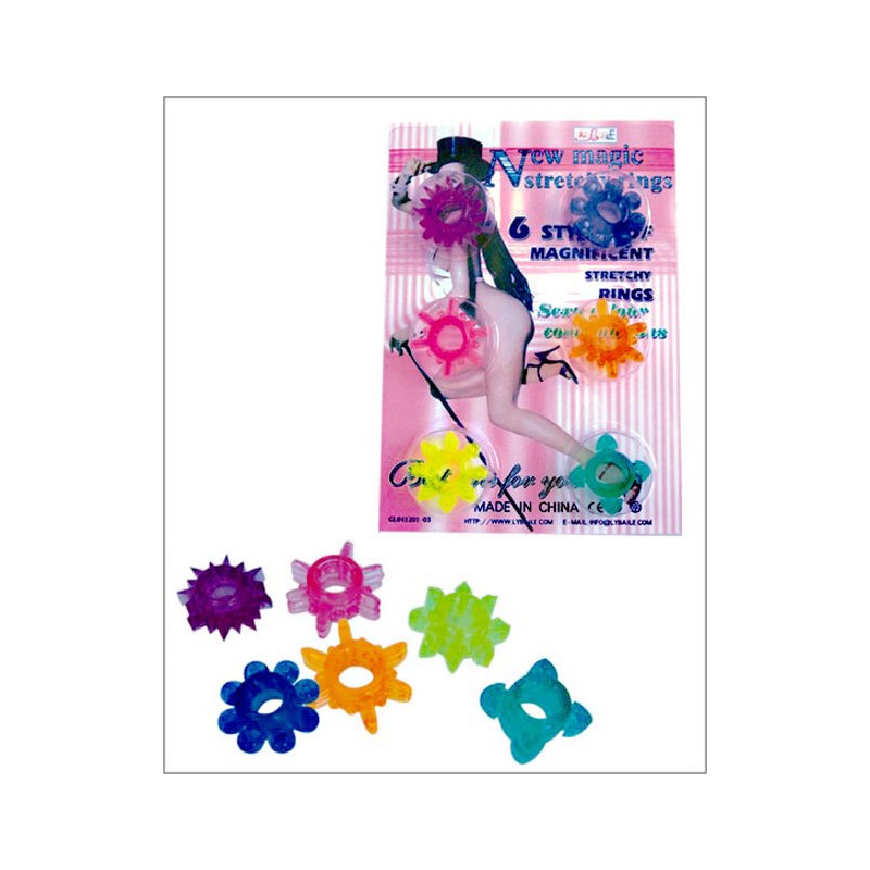 El kit se compone de 6 anillos de erección individuales que están hechos para él y tu satisfacción orgásmica. Los anillos super elásticos tienen pétalos con textura, protuberancias, cosquilleos y teasers con forma para una excitación alucinante y placer de estimulación. Los potenciadores reutilizables son fáciles de usar y cómodos de usar, y extienden la seducción sensual durante períodos prolongados de tiempo de juego.