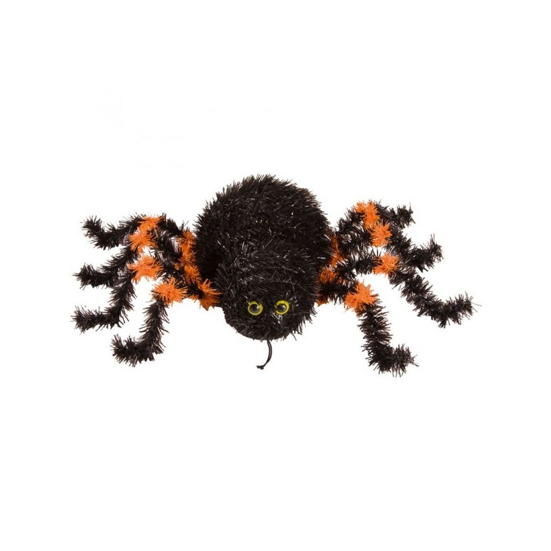 Araña en color negro y naranja,con pequeñas tiras de plastico imitando al pelo,trae un hilo para colgar ,pero se puede poner en superficie y decorar terrorificamente tu fiesta de Halloween.