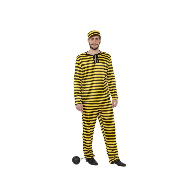 Disfraz de Preso a rayas negro y amarillo. Talla unica. Contiene pantalon,camisa y sombrero