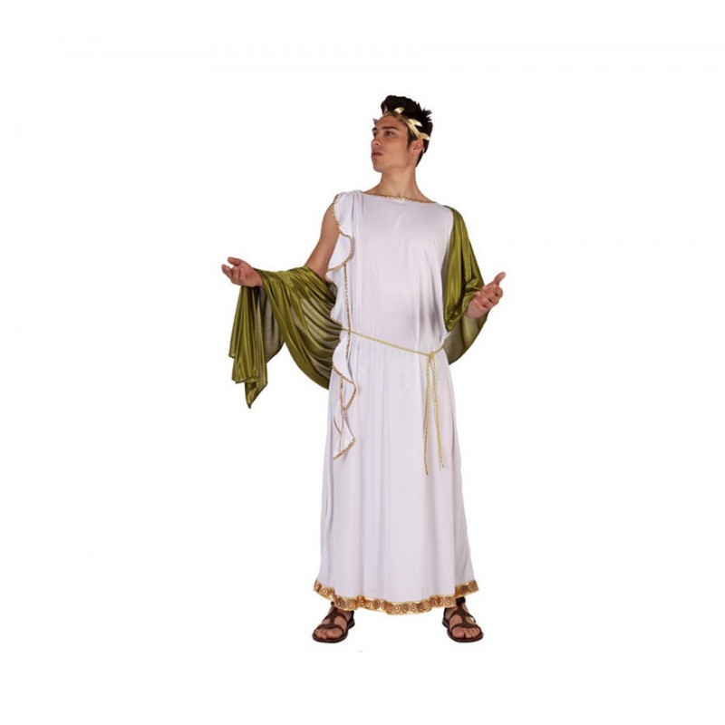 Disfraz de cesar romano,,tunica blanca con capa verde,rematado con pasamaneria dorada y cinturón
