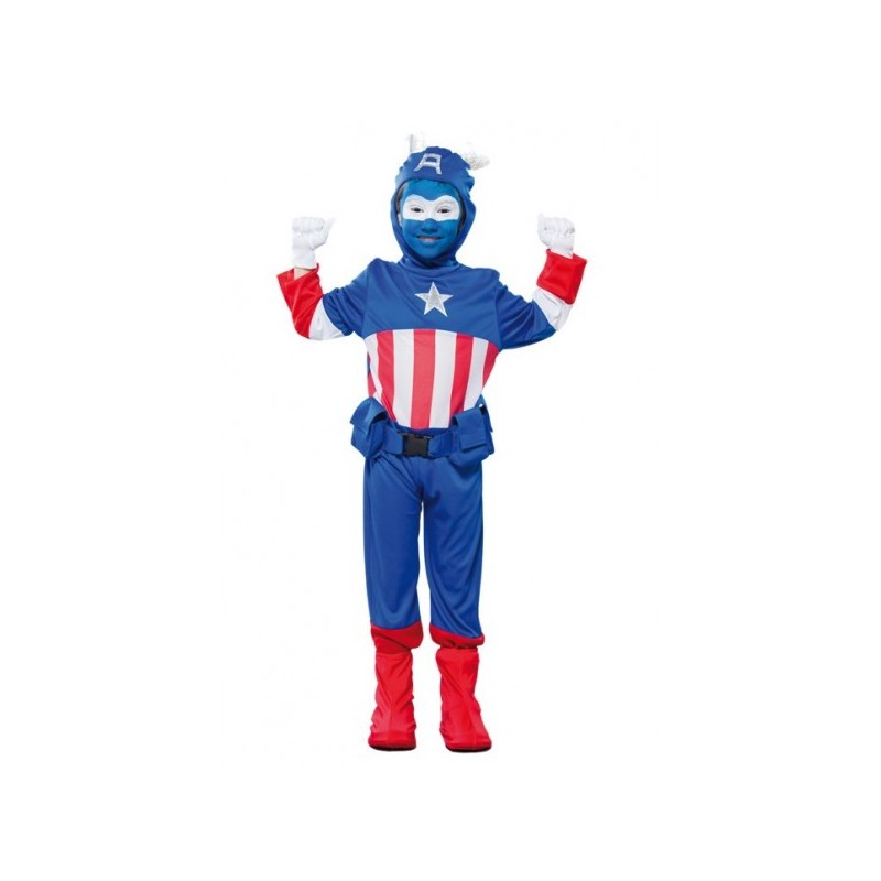 Disfraz de capitán azul Mono con gorro, cinturón.Con éste disfraz los niños podrán jugar a ser el mismísimo Capitán América.