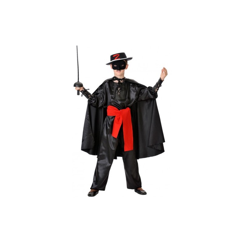 Disfraz del Zorro. para niño se compone de un top, un cinturón rojo, una capa y un pantalón elástico a la altura de la cintura. (Espada y sombrero no incluidos). Es un traje ideal para convertirte en el famoso justiciero del antifaz en una fiesta temática o de disfraces.