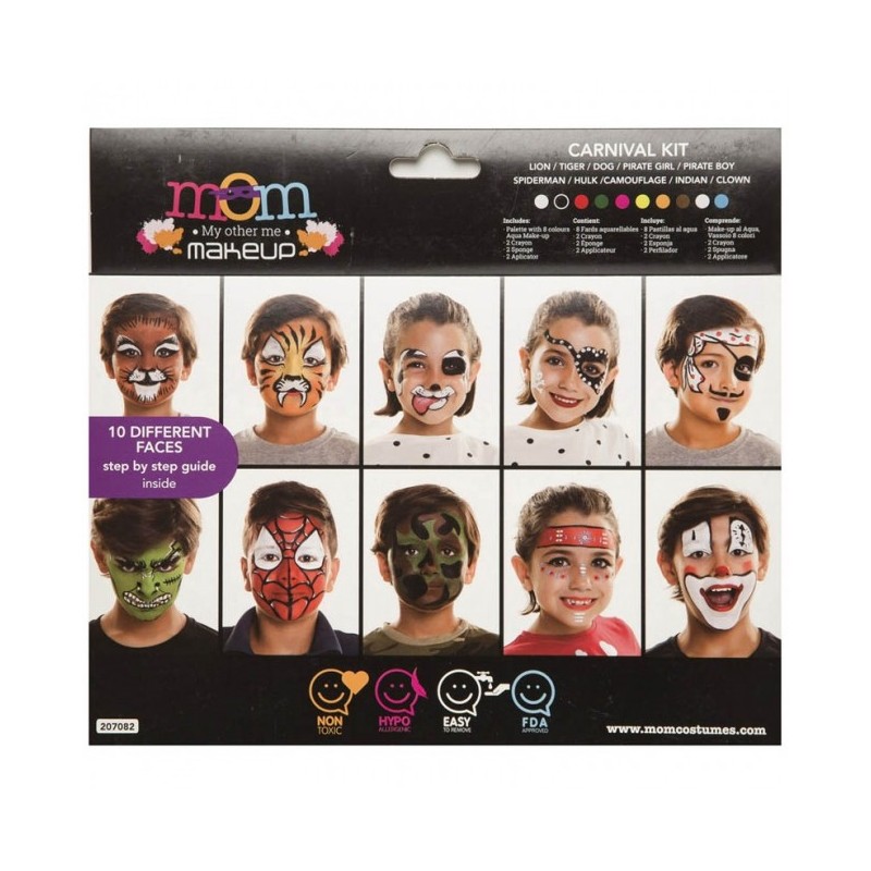 Set de maquillaje al agua,con el que podrás crear los más brillantes maquillajes, para carnaval,cumpleaños,fiestas o Halloween... Podrás hacer 10 maquillajes diferentes gracias a la guía paso a paso que encontrarás en el interior o los que se te ocurran con tu imaginacion.