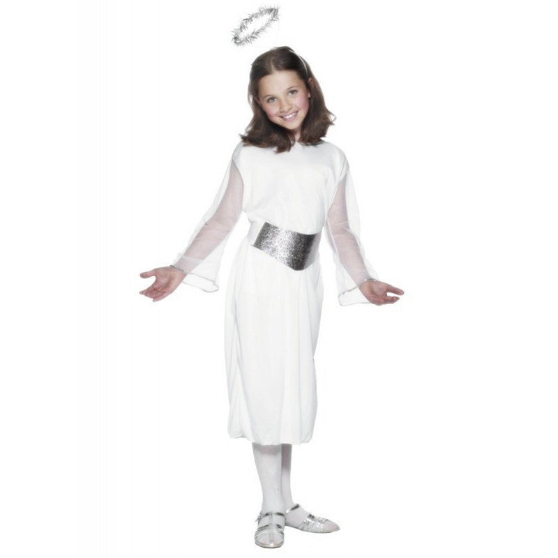 Disfraz de Ángel. Ideal para las actuacciones del colegio,cabalgata o fiesta navideña.Talla 4-6 años.Incluye tunica blanca con mangas de gasa y rematadas con lazo plateado y cinturon.No corona
