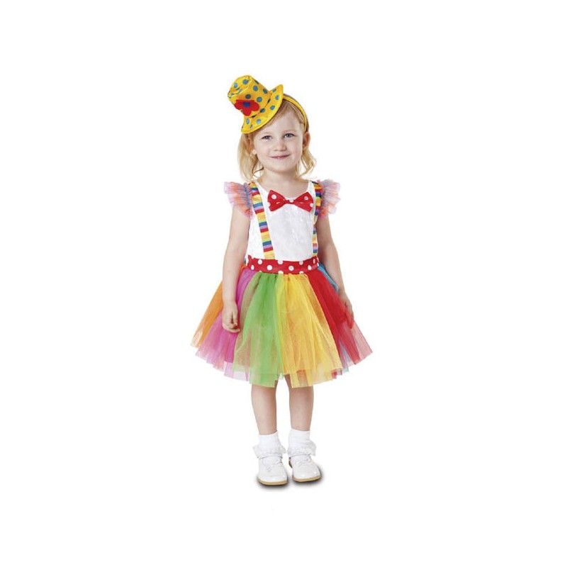 Original y divertido disfraz de payasita con tutú ideal para niñas en Carnaval y fiestas de temática circo. Disponible en tallas 1-2 y 3-4 Años