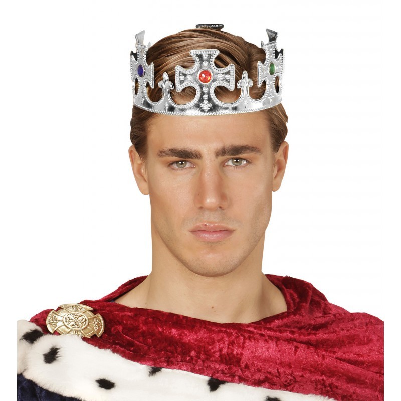 Corona de Rey.Esta brillante corona color plata está confeccionadas en PVC flexible y tiene unas puntas en forma de Cruz que le dan un toque de majestuosidad y distinción. Su diseño es ideal tanto para encarnar a un Rey, Reina, Princesa o Príncipe de la Corte en Fiestas de Disfraces, Carnavales oEspectáculos, como para emular a los Reyes Magos deOriente en las tradicionales Cabalgatas de Navidad.