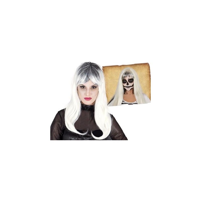 Peluca zombie , pelo blanco, largo y liso con mechas negras.Complemento ideal para asutar en Halloween