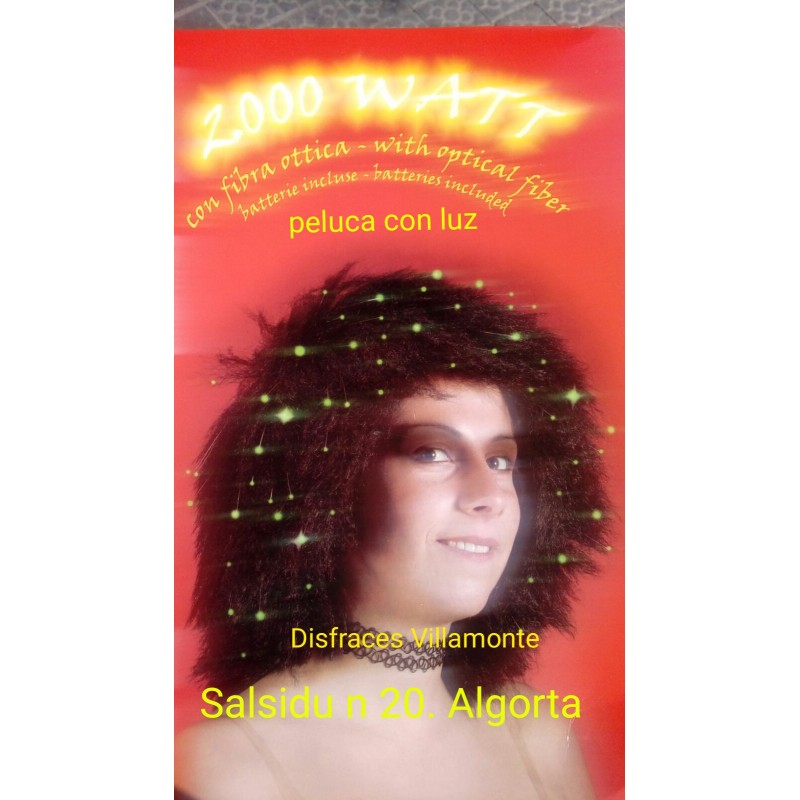 PelucaZoooWatt,con Luz.Lleva fibra optica por la peluca y con pilas se iluminan unas bombillitas.