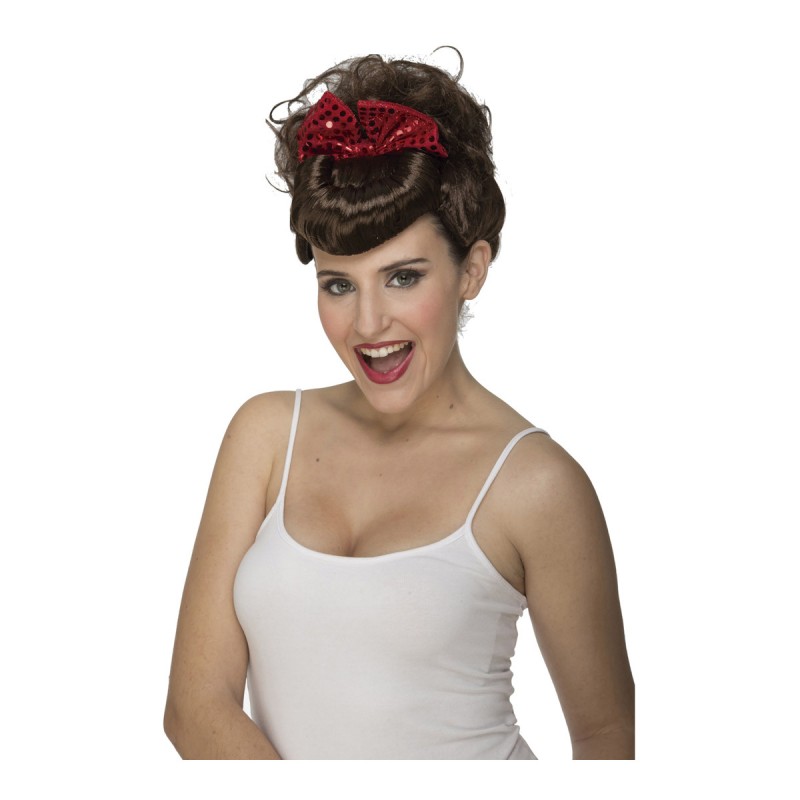 Esta peluca de Años 40 para mujer está hecha de pelo sintético. Es de color chocolate y están sujeta en un moño en la parte superior con con un pequeño lazo rojo de lentejuelas.
