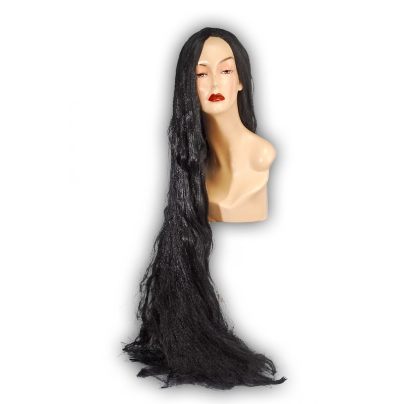 La peluca resalta por su larga melena lisa de más de 150 cm. en color negro