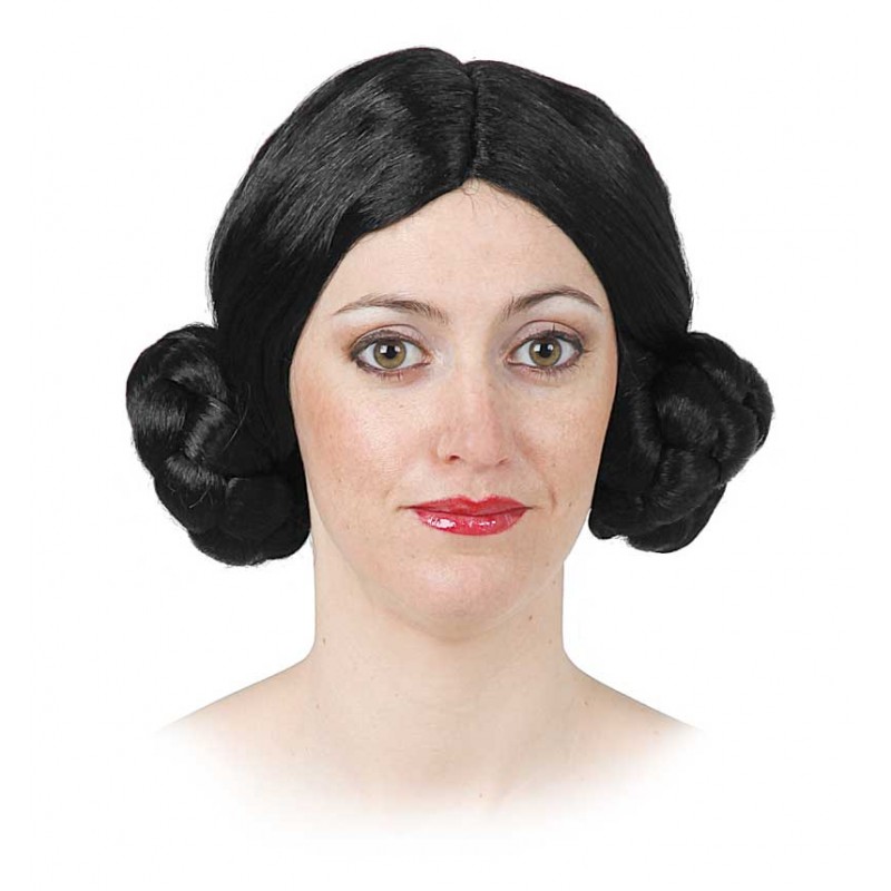 Peluca con moños laterales, con raya en el centro y dos trenzas laterales recogiendo todo el pelo y formando un moño en cada lado
