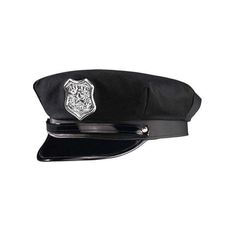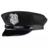 Una gorra de policía de tela en color negro con la visera y una cinta oscura ancha que rodea el contorno de charol negro. Trae una insignia del cuerpo de acabado metálico en el parte delantera.